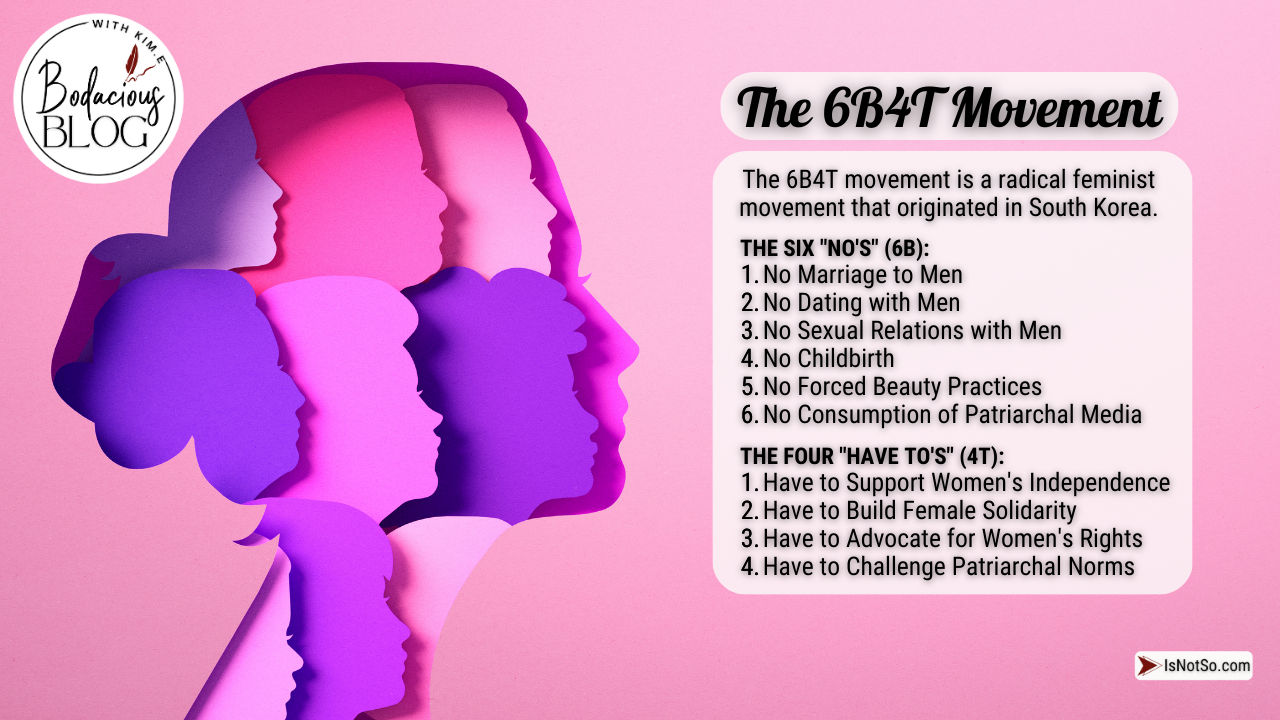 Have you ever heard of the 6B4T, a radical online feminist movement started in South Korea in 2019 that opposes sexism and patriarchal structures. These women refuse to date men, have sex with men, get married, or have children. South Korea, like all countries, has had a patriarchal system that suppressed equal rights for women. Although I am all for free will and equal rights of all people, I do not believe that such movements create the societal change we need. By abstaining from the very things, like sex, relationships, parenthood and commitment that enhance our human experience, and are all things we collectively need healing in, we rub salt in the deep wound and cause even more suffering and separation from ourselves. We must each learn how to heal our wounded masculine and feminine, and be empowered by our femininity and masculinity, and not over-powering and discriminatory. Both men and women have a lot to learn from one another. Rejecting, suppressing, controlling, manipulating or threatening one or the other is not the solution, and never has been.