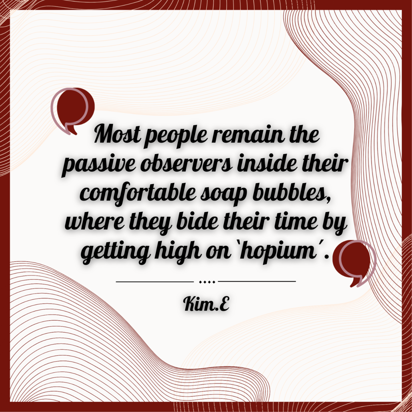 Kim.E discusses the concept of the 'Soap Bubble Syndrome’, where individuals remain passive in their comfort zones and avoid challenges by maintaining a superficial sense of harmony which deflects from their personal reality. Such a giddy state is addictive and thrives on hope, which Kim.E refers to...